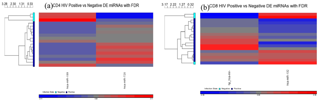 For the first contrast, we found three DE miRNA for the CD4+ T-cells and five for the CD8+ T-cells during viremia. No overlapping miRNAs were seen. In contrast, for the LTNP CD4+ and CD8+ T-cells, four DE miRNAs in CD4+ T-cells and five in CD8+ T-cells during the non-progressive phase of the HIV disease were identified. The miRNA-199a-5p was found to be specific to the HIV+ CD4+ T-cells. Interestingly, miRNA-126 was the only miRNA found overlapping between CD4+ and CD8+ T-cells during the non-progressive HIV disease, which, according to the current literature, is the first miRNA possibly related to the non-progression of HIV disease (Table 7 and Figure 12b). No differential expression was seen for the aviremic comparison. This suggests a degree of similarity in the miRNA profiles of the CD4+ and CD8+ T-cells of aviremic patients undergoing HAART (Figure 12a,b).