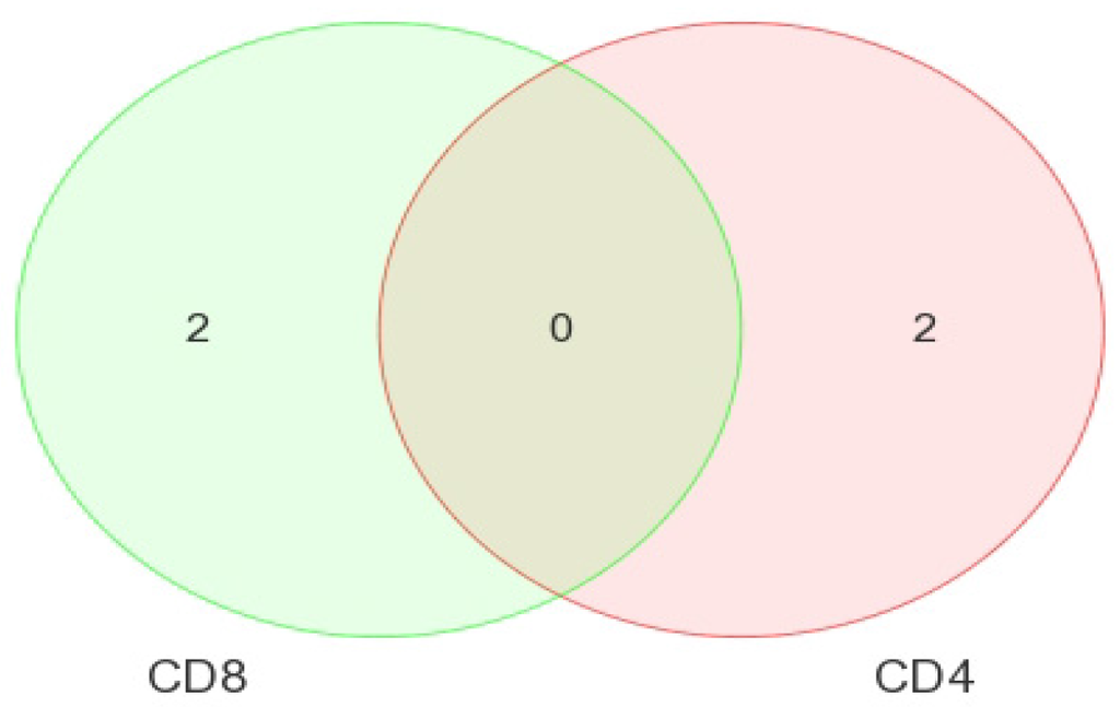 Venn diagram showing miRNAs specific to CD4+ and CD8+ T-cells with the absence of any overlapping miRNAs between these two cell types. Uninfected n = 3, and HIV-infected n = 15.