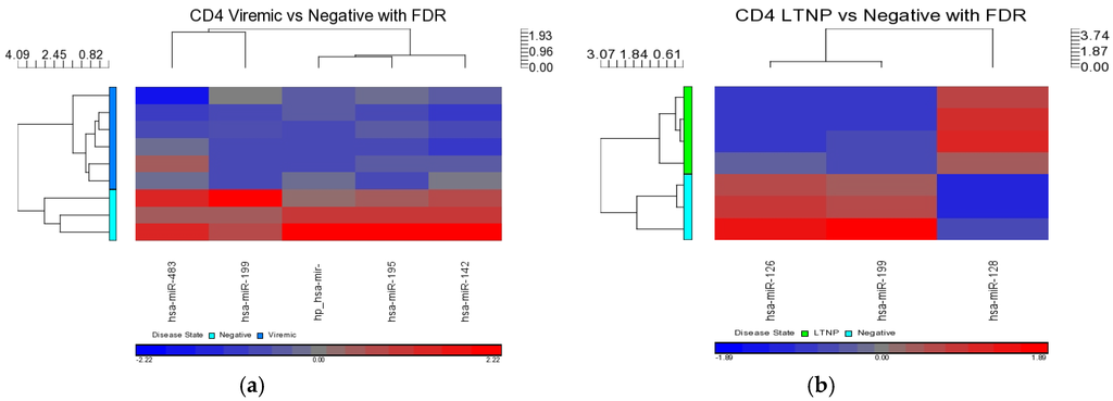 Heat maps indicating DE miRNAs in CD4+ T-cell disease group comparisons of viremic (a) and LTNP (b) compared to negative controls. FDR method was used. Viremic n = 6, LTNP n = 4, negative n = 3.