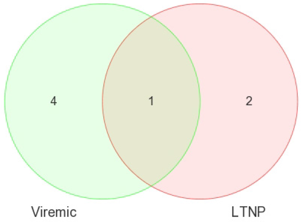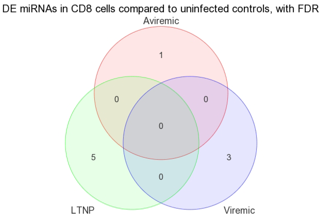 Venn diagram of DE miRNA in CD8+ T-cells when disease groups were compared to HIV– controls. FDR method with p < 0.05 was used. Viremic n = 6, aviremic n = 5, LTNP n = 4, negative n = 3.