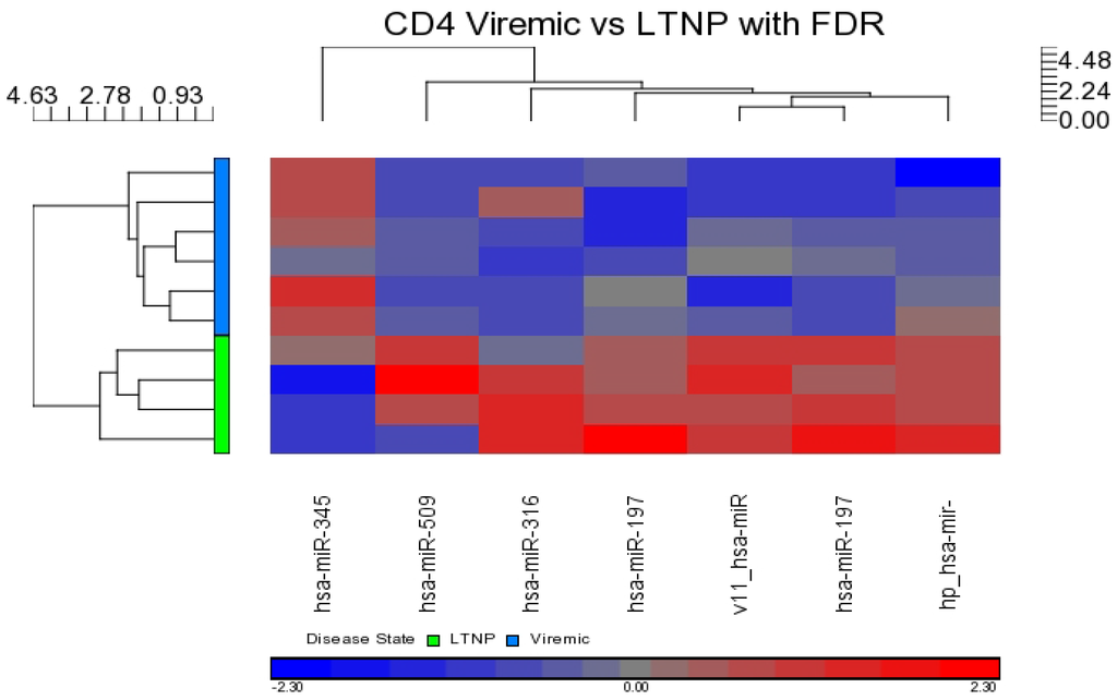 Heat map showing DE miRNAs in CD4+ viremic vs. LTNP disease group comparison. Viremic n = 6, LTNP n = 4.