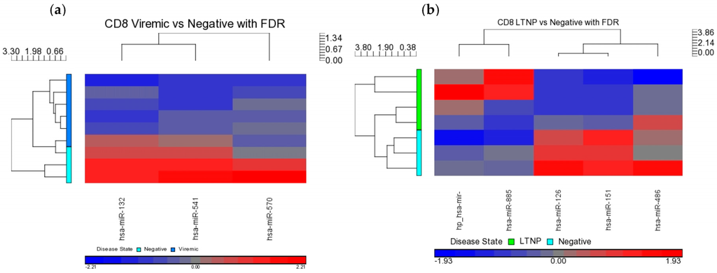 Heat maps indicating DE miRNAs in CD8+ disease group comparisons of viremic (a) and LTNP (b) compared to negative controls. Viremic n = 6, LTNP n = 4, negative n = 3.
