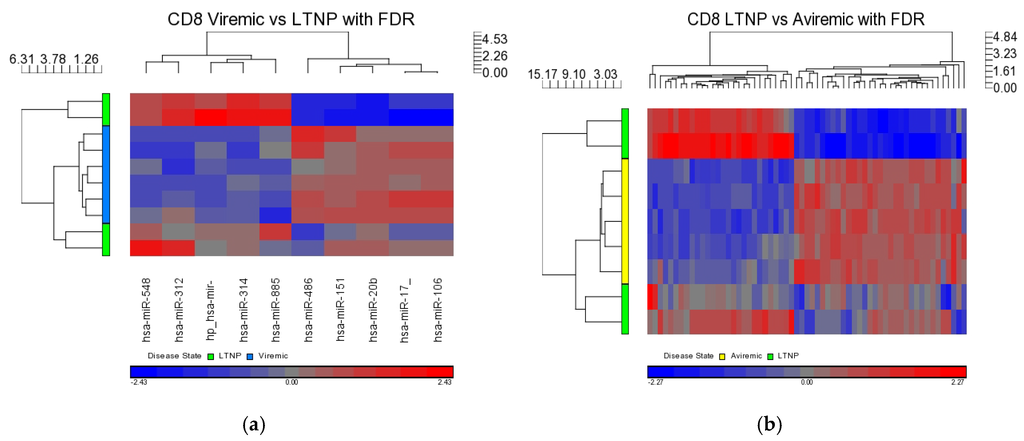 Heat maps indicating DE miRNAs in CD8+ viremic vs. LTNP (a) and LTNP vs. aviremic (b) disease group comparisons. FDR method with p < 0.05 was used. Viremic n = 6, aviremic n = 5, LTNP n = 4.