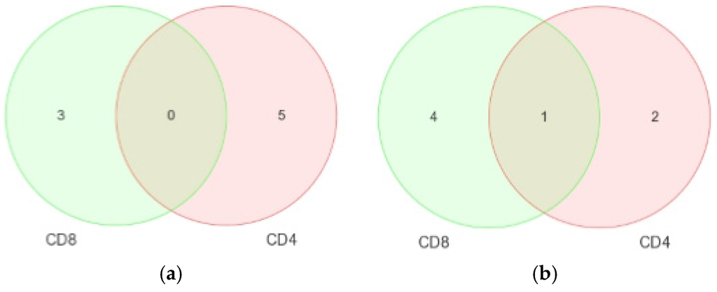 Venn diagrams showing DE miRNAs in the CD4+ and CD8+ cells of viremic (a) and LTNP (b) disease groups. FDR method with p < 0.05 was used.