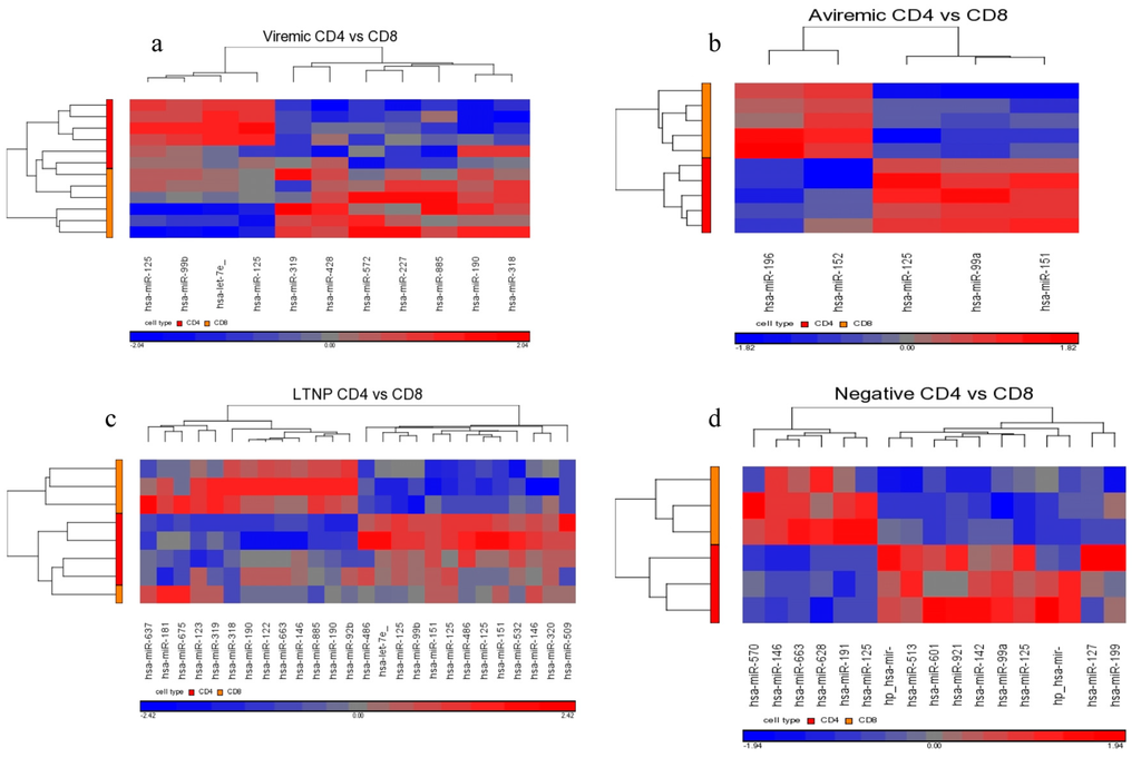 Heat map representation of miRNAs DE between CD4+ and CD8+ T-cells from disease groups viremic (a); aviremic (b); LTNP (c); and negative (d). Non-FDR method with p < 0.01 was used. For each cell type, viremic n = 6, aviremic n = 5, LTNP n = 4, and negative n = 3.