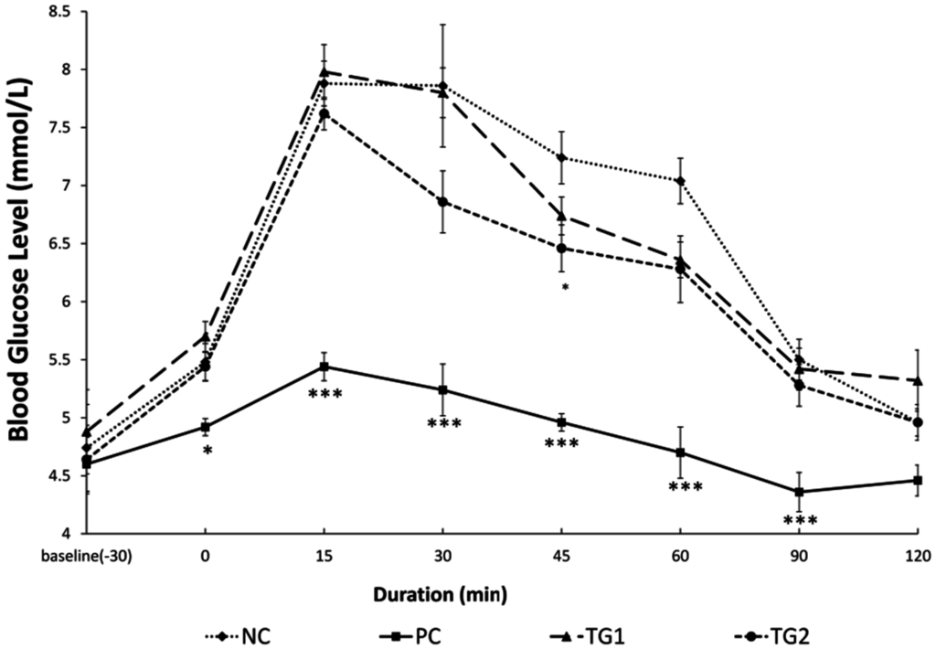 In comparison with NC, administration of metformin significantly (p < 0.05) reduced BGLs at minute 30 (Figure 1). Furthermore, after glucose loading, PC showed significantly (p < 0.001) lower glucose levels at minutes 15, 30, 45, 60, and 90. Similarly, TG2 showed significantly (p < 0.05) lower BGLs at minute 45 compared with NC.