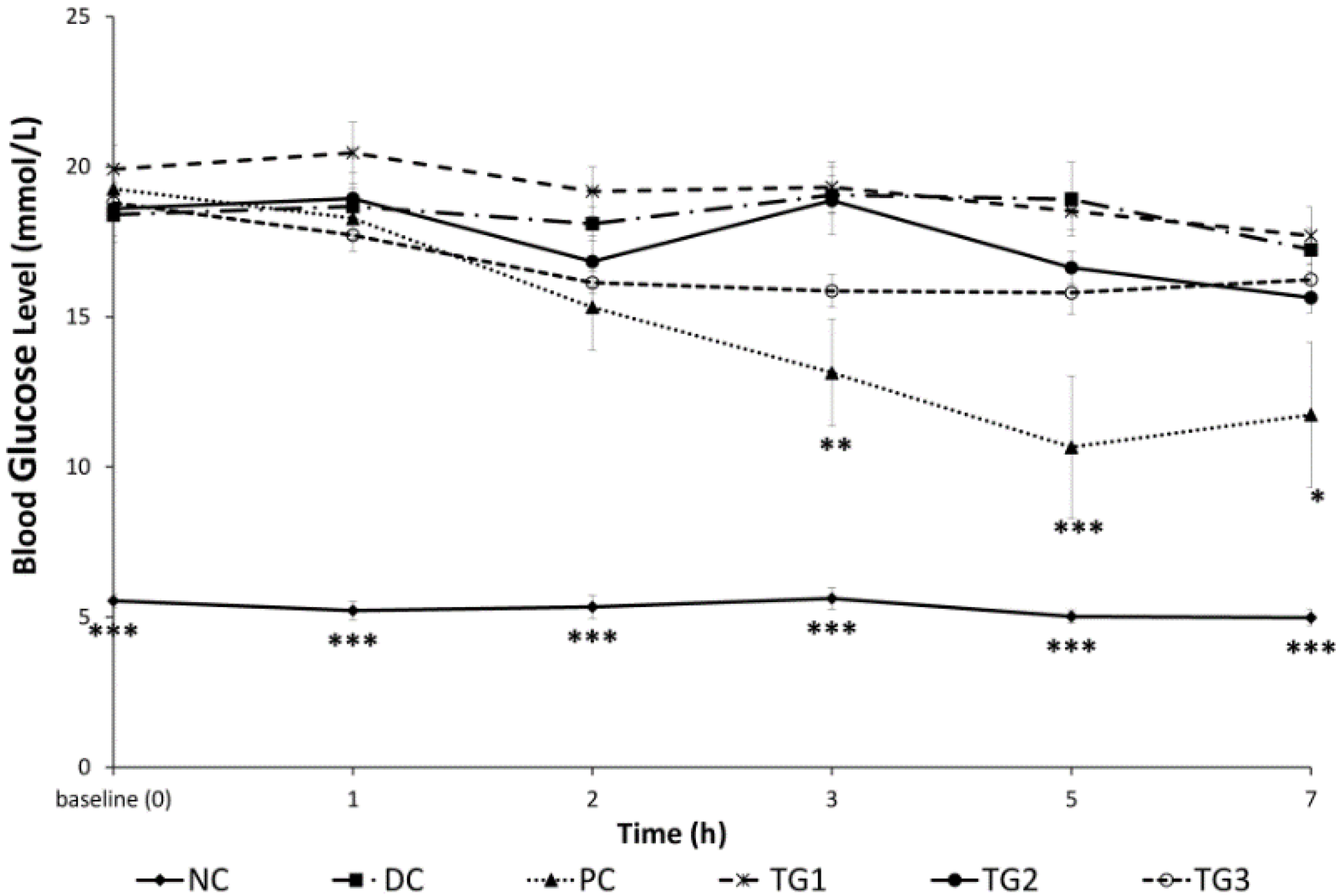 Acute (single) treatment with Gongronema latifolium extract in STZ-induced diabetic rats (n = 5). Values are expressed as the mean ± SEM, * = p < 0.05; ** = p < 0.01; *** = p < 0.001 vs. DC.