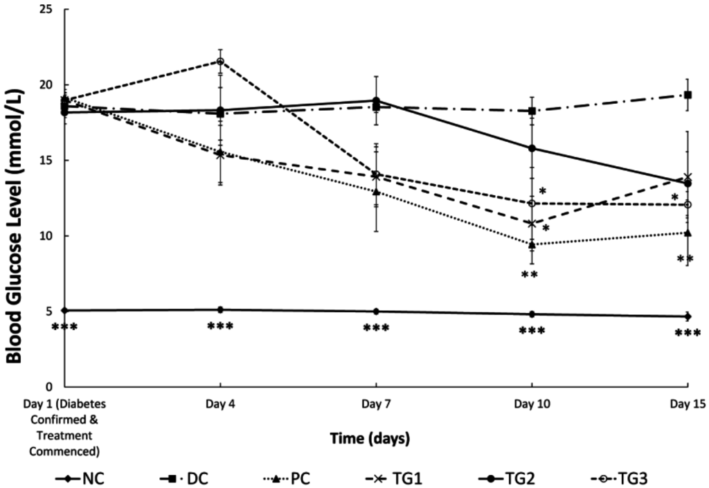 Sub-chronic (14 days) treatment with Gongronema latifolium extract in STZ-induced diabetic rats (n = 6). Values are expressed as the mean ± SEM, * = p < 0.05; ** = p < 0.01; *** = p < 0.001 vs. DC.