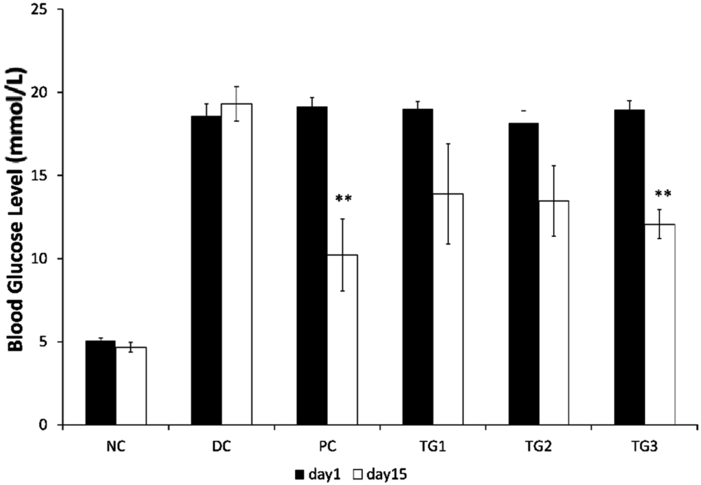 Comparing blood glucose levels before and after 14 days of treatment with Gongronema latifolium extract. Values are expressed as the mean ± SEM, ** = p < 0.01.