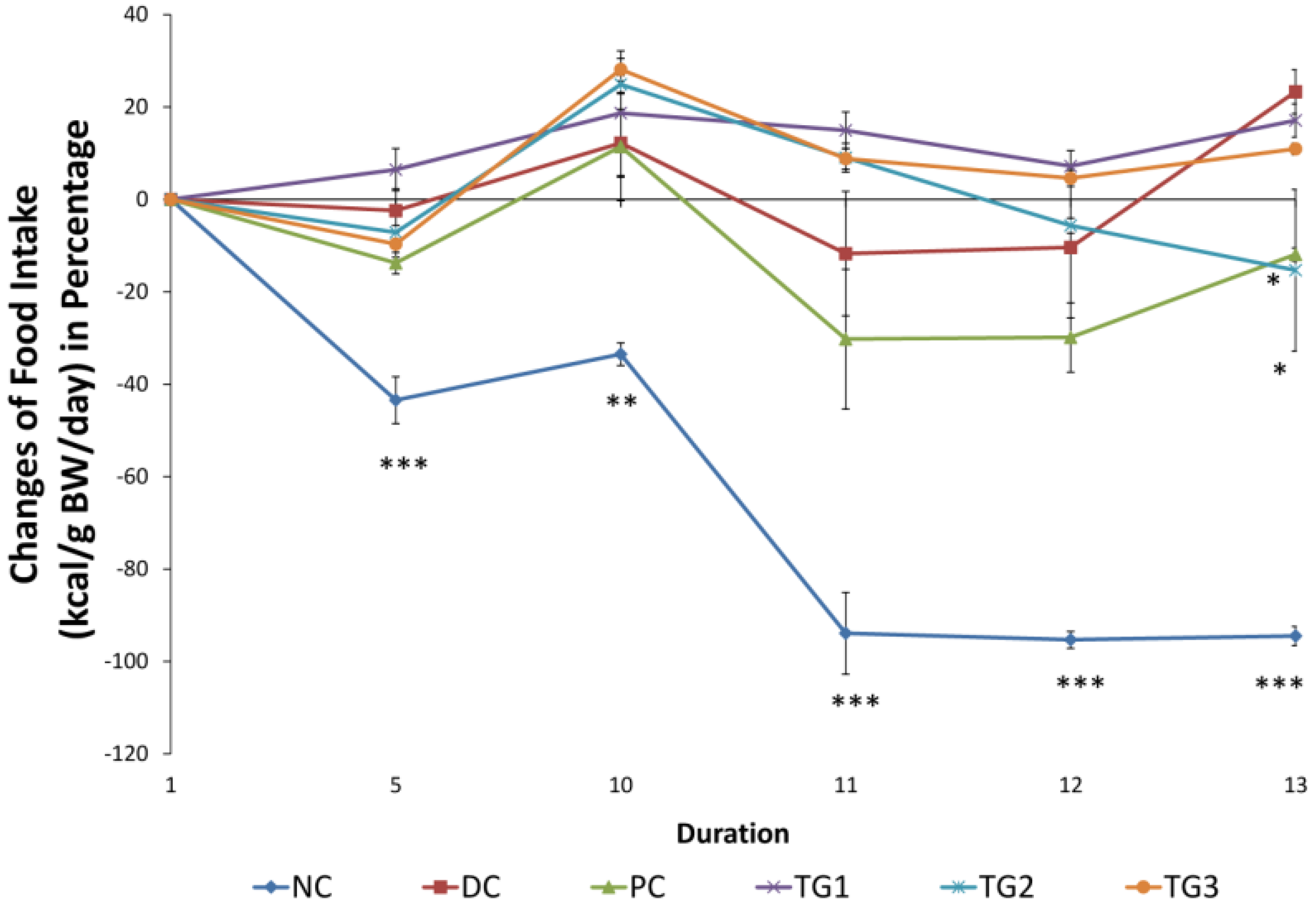 Percentage of change in food intake (kcal/g b.w./day) during sub-chronic treatment with Gongronema latifolium extract. Values are expressed as the mean ± SEM, * = p < 0.05; ** = p < 0.01; *** = p < 0.001 vs. DC.