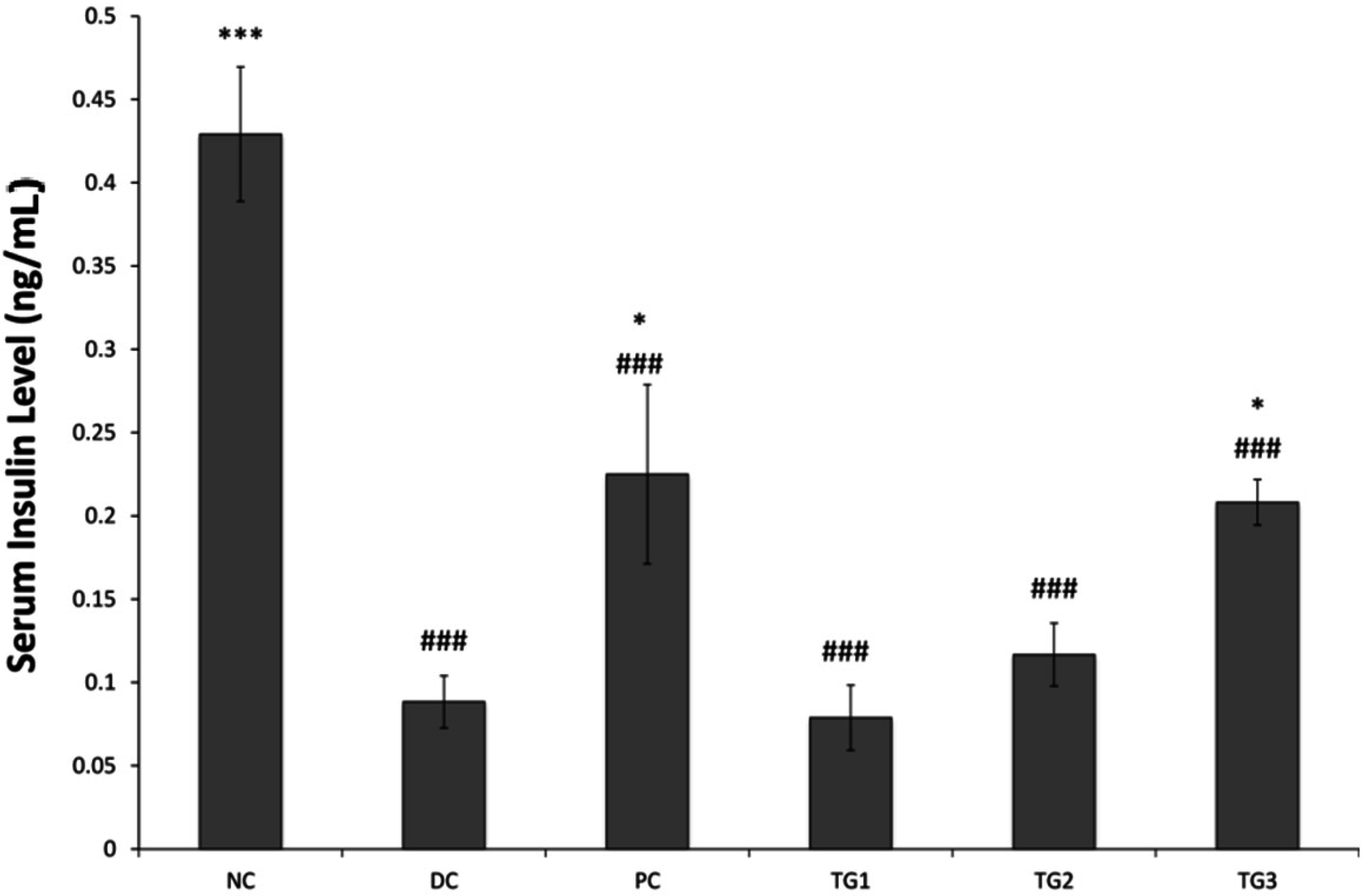 Serum Insulin Levels after 14 days of treatment with Gongronema latifolium extract. Values are expressed as the mean ± SEM, * = p < 0.05; *** = p < 0.001 vs. DC; ### = p < 0.001 vs. NC.