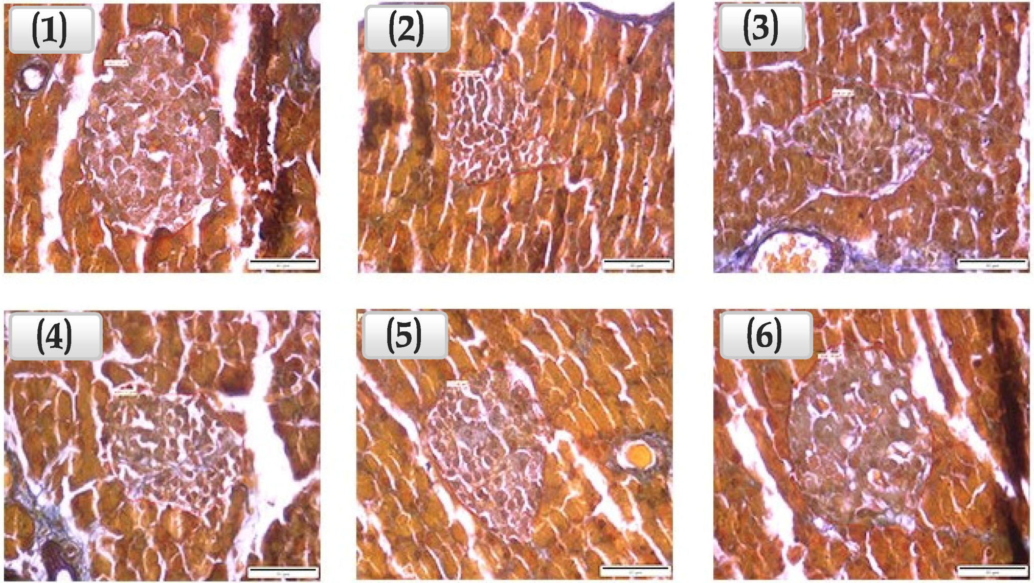 Langerhans islets under 400× magnification power. (1) NC: langerhans islets are clearly defined in an organized cyto-architecture. Secretory acini, centroacinar cells and excretory ducts appear to be well defined; (2) DC: Cytotoxic effects of Streptozotocin seem to have caused a distortion in the architecture of the pancreatic tissues. The islets are greatly reduced in size and number and the islet cells appear necrotic with marked vacuolations; (3) PC: cyto-architecture appears distorted. Langerhans islets are reduced in size and number, with necrotic acinar cells and degenerate islet cells; (4) TG1: Langerhans Islets appear to be small, with minor vacuolations and cyto-architecture distortion; (5) TG2: Langerhans Islets appear to be large and defined. Minor vacuolations and cyto-architecture distortion are present. Secretory acini, centroacinar cells and excretory ducts appear to be well defined; (6) TG3: Islet cells appear to be prominent and large. Edges seem to be well defined.