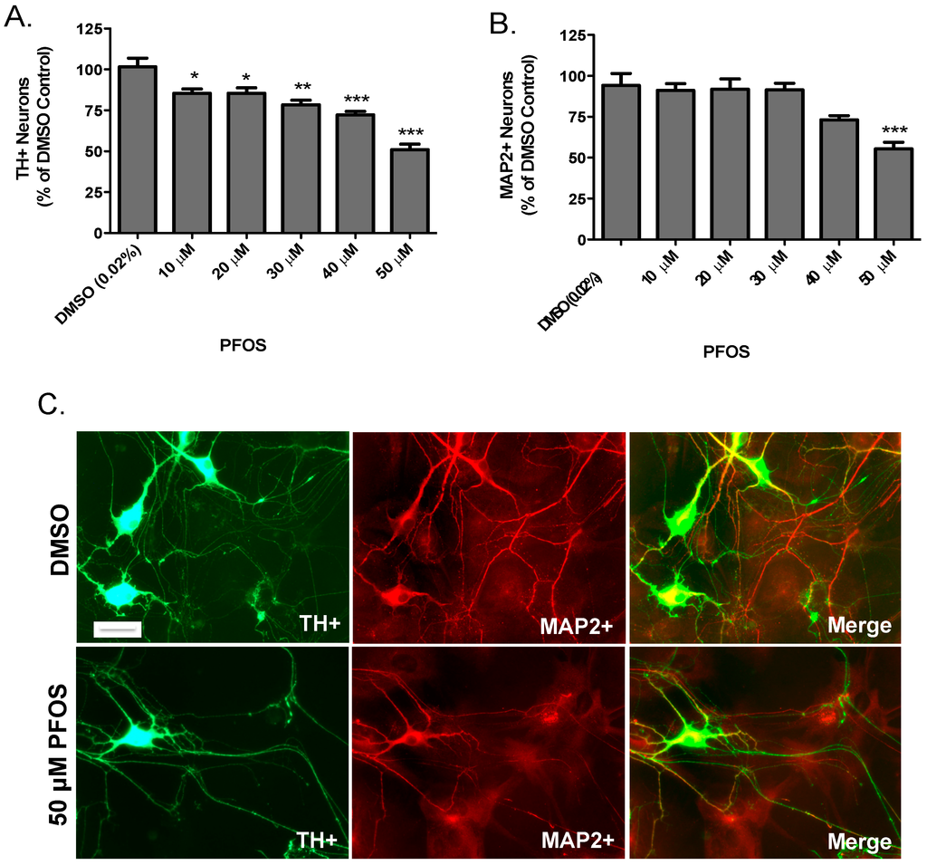 Acute exposure to PFOS results in a preferential reduction in the number of primary cultured dopaminergic neurons. (A) Treatment with PFOS resulted in a significant reduction in the number of TH+ neurons, beginning at 10 μM; (B) treatment with PFOS did not elicit overt loss of non-dopaminergic neurons (MAP+), except at the highest concentration of PFOS (50 μM); and (C) representative images of TH+ and MAP2+ neurons following treatment with DMSO or 50 μM PFOS. Scale bar: 10 μm. Columns represent the percent change from DMSO control. Data represent the mean + SEM of 6 experimental replicates per treatment group performed over three separate experiments. * Values statistically significant from DMSO control (p < 0.05). ** Values statistically significant from DMSO control (p < 0.01). *** Values statistically significant from DMSO control (p < 0.001).