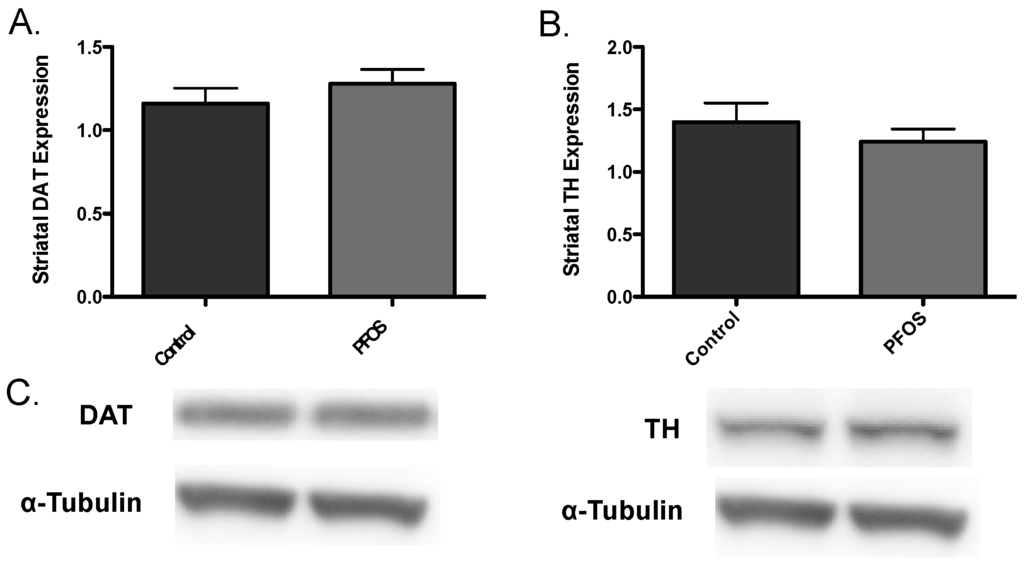 In vivo exposure to PFOS does not elicit an alteration in synaptic dopaminergic proteins. Exposure of nine-week-old C57BL/6J male mice to 10 mg/kg PFOS for 14 days did not result in an explicit alteration in the expression levels of striatal DAT (A) or TH (B). (C) are representative immunoblots of DAT and TH. α-Tubulin was included to ensure even protein loading. Columns represent the mean of raw values + SEM (six mice per treatment group).