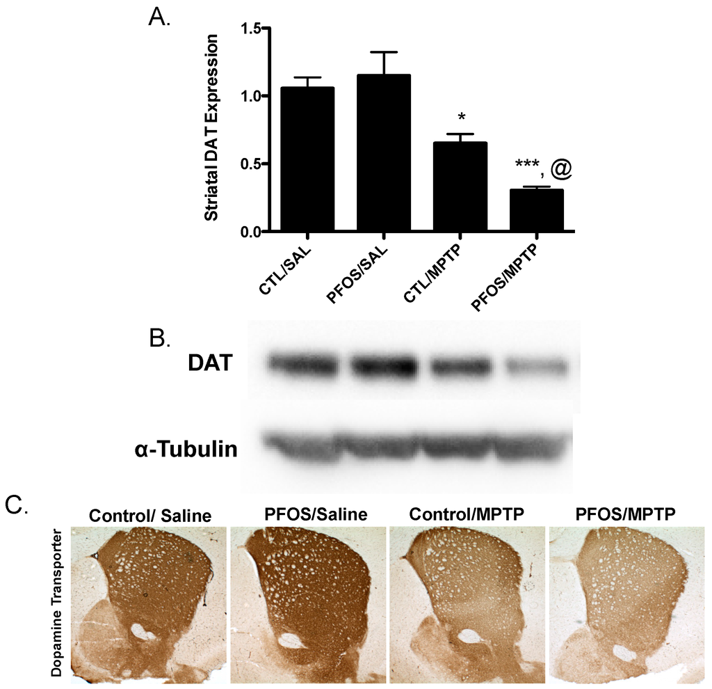 Challenge with the dopamine neurotoxin, MPTP, causes significant reductions in DAT expression following PFOS treatment. An additional cohort of nine-week-old C57BL/6J male mice were exposed to 10 mg/kg PFOS for 14 days. One day following the last PFOS exposure, mice were injected with saline or 10 mg/kg MPTP at 7:00 a.m. and 7:00 p.m. and then allowed to sit for seven days before analysis. (A) Treatment with MPTP resulted in a significant reduction in the expression in striatal DAT in control animals that did not receive PFOS. Moreover, treatment with MPTP exacerbated reductions in striatal DAT in animals that had received PFOS prior to MPTP treatment; (B) and (C) are representative immunoblot and immunohistochemical processing, respectively, demonstrating the reductions in DAT expression in the striatum of treated animals. α-Tubulin was included to ensure even protein loading. Columns represent means of raw data + SEM (six mice per treatment group). * Values statistically significant from CTL/SAL (p < 0.05). *** Values statistically significant from PFOS/SAL (p < 0.001). @ Values statistically significant from CTL/MPTP (p < 0.01).