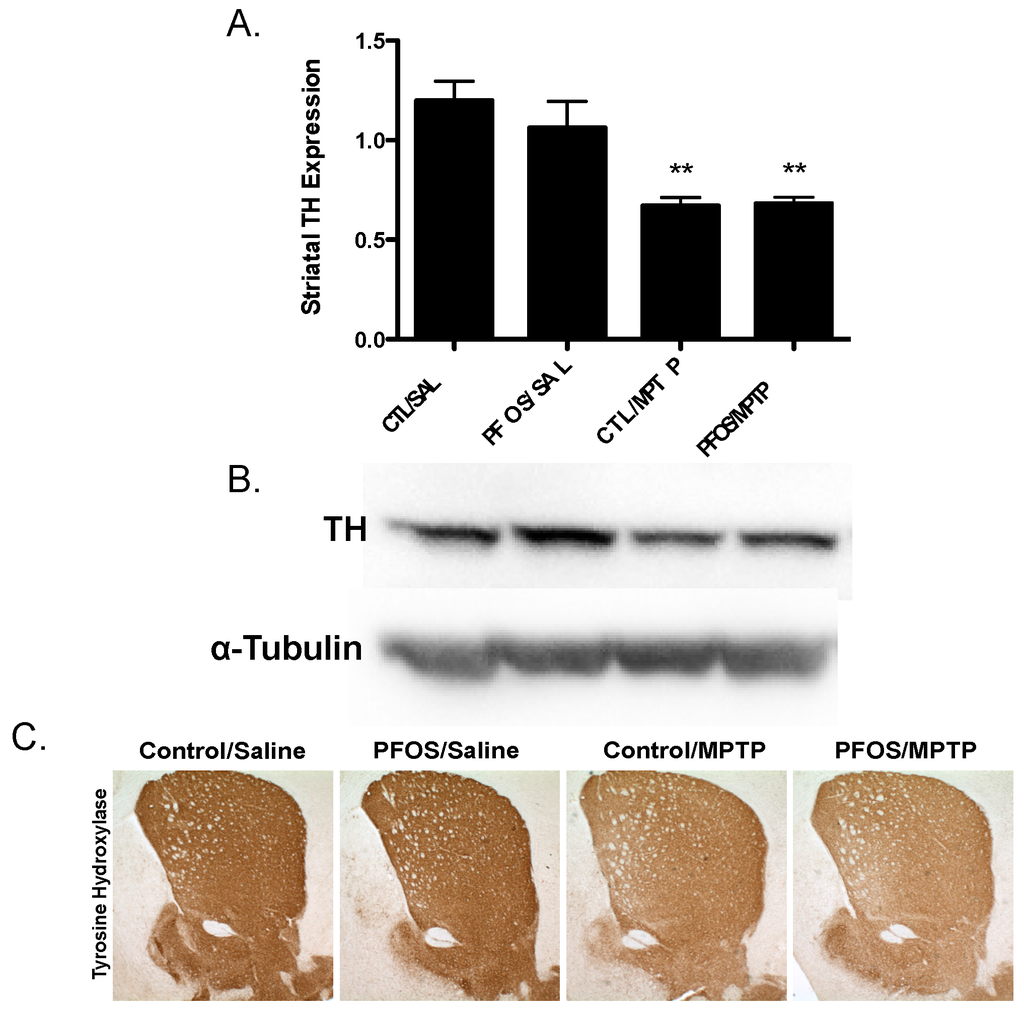 Challenge with the dopamine neurotoxin, MPTP, does not cause significant reductions in TH expression following PFOS treatment. (A)Treatment with MPTP elicited a significant reduction in the expression of striatal TH in control animals. However, prior exposure to PFOS did not potentiate a greater reduction in TH following MPTP treatment. (B) and (C) are representative immunoblot and immunohistochemical processing, respectively, demonstrating the reductions in TH expression in the striatum of treated animals. α-Tubulin was included to ensure even protein loading. Columns represent means of raw data + SEM (six mice per treatment group). ** Values statistically significant from CTL/SAL or PFOS/SAL (p < 0.01).
