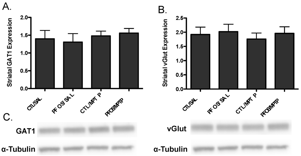 PFOS and MPTP do not alter the expression of GABAergic or glutamatergic proteins in the striatum. Neurotoxicological effects of PFOS appear to be preferential for dopaminergic terminals, as no change was observed in expression of GABAergic (A) or glutamatergic (B) presynaptic proteins in the striatum; and (C) representative imunoblots for vGAT and vGlut. α-Tubulin was included to ensure even protein loading. Columns represent means of raw data + SEM (six mice per treatment group).