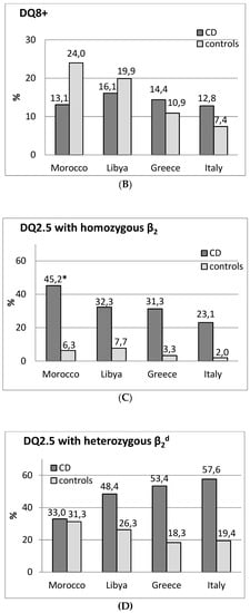 Distribution of HLA-DR-DQ genotypes in celiac disease (CD) and controls from Morocco a, from North Africa b and from other Mediterranean populations c. Genotype frequencies (%) are reported on the top of the columns. A) frequencies of DQ2.5 positive/DQ8 negative individuals; B) frequencies of DQ8 positive individuals; C) frequencies of DQ2.5 with homozygous β2 chain individuals (DQ2.5 homozygous); D) frequencies of DQ2.5 with heterozygous β2 chain individuals. * p < 0.001 vs. controls. d Figure 1D includes DQ8+ individuals (DQ2.5/DQ8 genotypes). Population references: a Present study; b Lybia []; c Greece []; Italy [].