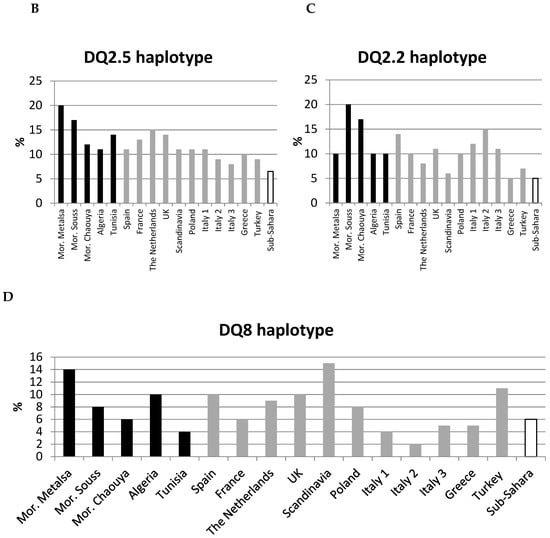 Prevalence of CD in North Africa is increasing; in the past it was underestimated, but in the last 10–15 years it reached around 1%, as observed in Western countries [], that is considered the worldwide prevalence of CD. However, with the spread of diagnostic and screening strategies, increased awareness of the disease, and evaluation of subjects with mild or atypical symptoms, CD prevalence could be even greater in North Africa []. In this study, HLA frequencies of both North Africans and Sub-Saharans, where populations exhibit low frequencies of HLA-DQ predisposing genotypes [,], were included in the comparisons to evaluate the relevance of HLA genetic risk on CD development in the Maghreb area.