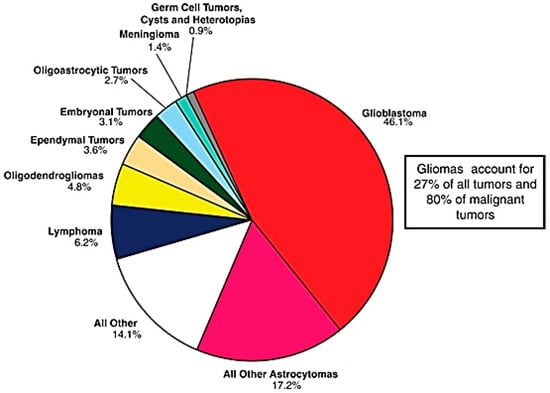 Malignant brain tumours represent some of the most devastating diagnoses a clinician may ever deliver to a patient. The most common malignant tumours of the brain are gliomas, accounting for over 80% of all primary brain malignancies as demonstrated in Figure 1 [1]. These cancers are aggressive, invasive, and destructive tumours, considered among the deadliest forms of human cancers [2]. “Glioma” is a general term used to characterize any tumour that originates from glial brain cells. There are three main cell types of glial origin with the potential to produce tumours. These include astrocytes leading to astrocytomas (including glioblastomas), oligodendrocytes giving rise to oligodendrogliomas, and ependymal cells forming ependymomas. Recent advances have rendered this method of classification obsolete, and the World Health Organization (WHO) 2016 4th edition classification standards include further separation of these subsections based on molecular and genetic traits.