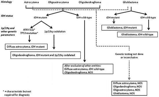 - Sahm, F.; Reuss, D.; Koelsche, C.; Capper, D.; Schittenhelm, J.; Heim, S.; Jones, D.T.; Pfister, S.M.; Herold-Mende, C.; Wick, W.; et al. Farewell to Oligoastrocytoma: In Situ Molecular Genetics Favor Classification as Either Oligodendroglioma or Astrocytoma. Acta Neuropathol. 2014, 128, 551–559. [Google Scholar] [CrossRef] [PubMed]