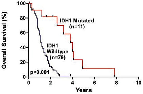Glioblastoma survival curve by IDH1 status. Black curve indicates survival for individuals with IDH1 wild-type status, whereas the red curve indicates individuals with IDH1 mutations. The p-Value for this relationship is less than 0.001. Reproduced with permission from [23].