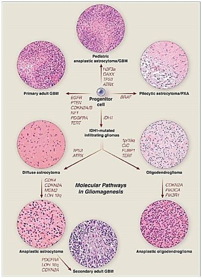 - Appin, C.L.; Daniel, J.B. Molecular Pathways in Gliomagenesis and Their Relevance to Neuropathologic Diagnosis. Adv. Anat. Pathol. 2015, 22, 50–58. [Google Scholar] [CrossRef] [PubMed]
