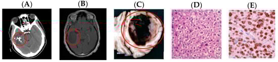 Comparative images of oligodendrogliomas. Arrows and circles added to assist with identification of pathology. (A) Left frontal oligodendroglioma—axial CT. Modified after [48]; (B) left frontal oligodendroglioma—axial fluid attenuated inversion recovery (FLAIR) MRI. Modified after [49]; (C) oligodendroglioma—gross pathology specimen. Modified after [50]; (D) round nuclei with surrounding clear cytoplasm characteristic of oligodendrogliomas—H and E stain. Reproduced from [51]; and (E) R132H+ immunohistological stain specific to IDH1 mutation. Reproduced from [50].