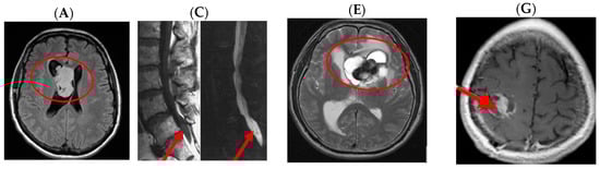 Ependymoma subtypes. Arrows and circles added to assist with identification of pathology. (A) Subependymoma pushing into the lateral ventricle—T2 FLAIR axial cross section MRI image. Modified after [53]; (B) gross specimen, arrows pointing to subependymoma pushing into fourth ventricle. Modified after [54]; (C) myxopapillary ependymoma in caudal spinal cord—CT. Modified after [55]; (D) myxopapillary ependymoma near cauda equine—gross specimen. Reproduced from [56]; (E) ependymoma in left lateral ventricle—T1 weighted axial cross section MRI image. Modified after [57]; (F) large ependymoma encompasses entire fourth ventricle—gross specimen. Reproduced from [58]; (G) anaplastic ependymoma—CT image. Modified after [59]; and (H) ependymoma pseudorosette encroachment on neighboring blood vessels. Reprodcued from [60].