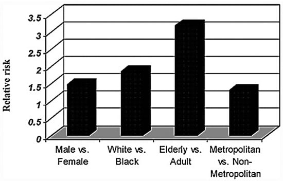 Relative risk of glioma diagnosis per the demographics in the United States (1973–2001, Surveillance, Epidemiology, and End Results SEER Registries). Reproduced with permission from [69].