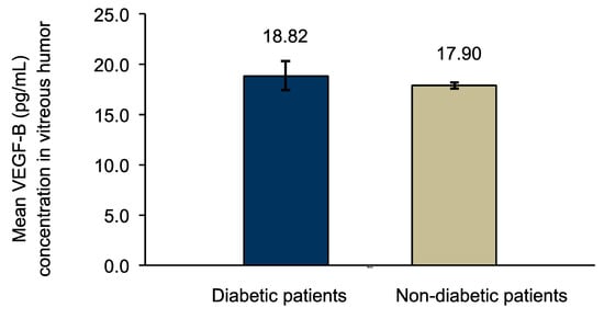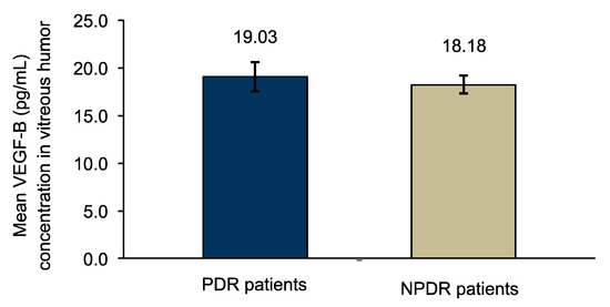 Mean VEGF-B measurements were higher in vitreous humor of patients with PDR (19.03 ± 1.52 pg/mL) vs. NPDR (18.18 ± 0.96 pg/mL), and this difference was statistically significant (p = 0.025) (Figure 2).