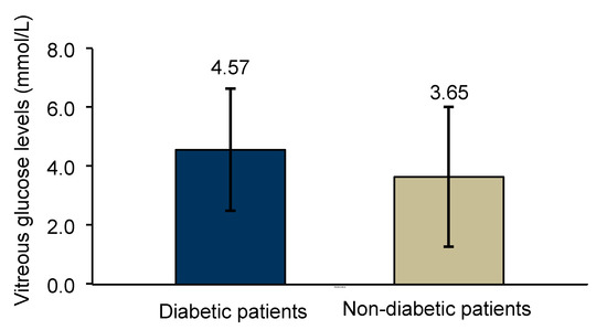 Diabetic patients showed increased levels of glucose in vitreous humor (4.57 ± 2.07 mmol/L) when compared with non-diabetic patients (3.65 ± 2.39 mmol/L), but this difference was not statistically significant (p = 0.300) (Figure 3).