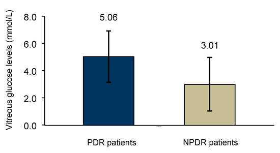 In this analysis, patients with PDR showed to have statistically higher values of glucose in vitreous when compared to NPDR group of patients (5.06 ± 1.89 mmol/L vs. 3.01 ± 1.98 mmol/L; p = 0.032) (Figure 4).