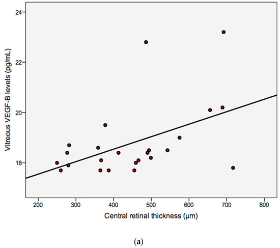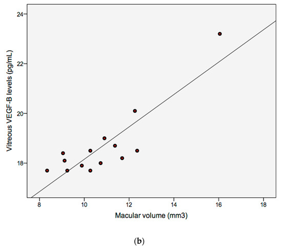 The correlation between vitreous VEGF-B of DR patients and CRT was statistically significant, positive, and moderate: rs = 0.441 (p ≤ 0.05), as seen in Figure 5a. Moreover, the correlation between vitreous VEGF-B and MV in these patients was statistically significant, positive, and robust: rs = 0.716 (p ≤ 0.01), as observed in Figure 5b.