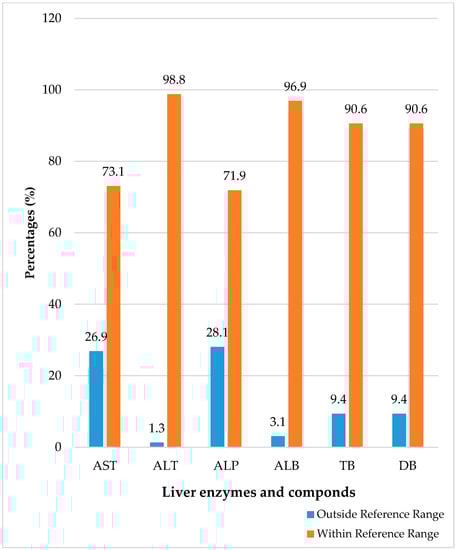 As shown in Figure 1, most of the patients had their liver enzymes and compounds within the reference range. Out of the 160 serum samples subjected to liver function tests, 45 (28.1%) had elevated levels of ALP, 43 (26.9%) had elevated levels of AST, 15 (9.4%) had elevated levels of direct bilirubin, and only 2 (1.3%) had ALT levels above the reference limit.