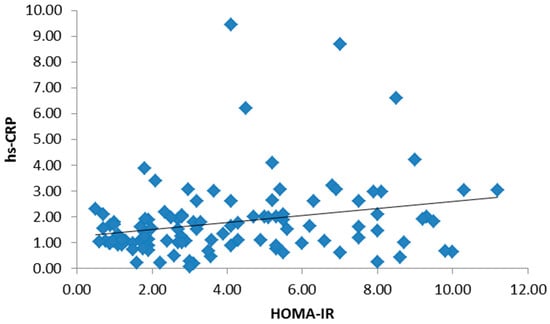 Significant positive correlation between high-sensitivity C-reactive protein (hs-CRP) and Homeostatic Model Assessment-Insulin Resistance (HOMA-IR).