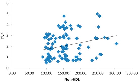 Significant positive correlation between tumor necrosis factor-α (TNF-α) and non-HDL.
