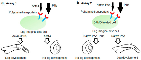 Drosophila assays used to characterize polyamine transport inhibitors. Native PAs: native polyamines; PTIs: polyamine transport inhibitors. (a) Assay 1: Undeveloped leg imaginal discs were incubated with ecdysone to promote development. In the presence of Ant44 (5), a toxic polyamine analog that targets the transport system, leg imaginal discs will not develop. The ability of candidate PTIs to rescue development of imaginal discs treated with Ant44 (5) was then assayed by monitoring and scoring the leg development process. (b) Assay 2: Leg imaginal discs treated with DFMO fail to develop in the presence of ecdysone. Uptake of exogenous native polyamines can rescue DFMO inhibition of disc development. The ability of candidate PTIs to block rescue of disc development in the presence of DFMO and native polyamines was tested.