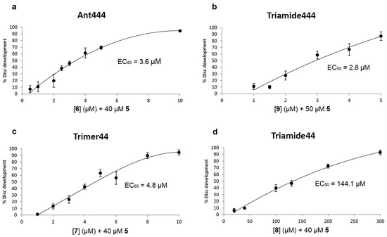 Compounds Ant444 (6) and Triamide444 (9) are effective PTIs. Candidate PTIs Ant444 (6) and Triamide444 (9) were tested in the presence of a toxic concentration of Ant44 (5) that by itself permitted the development of fewer than 10% of imaginal discs. The percentage of imaginal discs that developed was determined for each PTI concentration tested (see Section 2.3 for details). All assays were repeated at least in triplicate. Error bars reflect the standard error of the mean (SEM). (a–d) Respective dose-response curves of (a) Ant444 (6), (b) Triamide444 (9), (c) Trimer44 (7) and (d) Triamide44 (8) in blocking the inhibitory effect of Ant44 (5) on imaginal disc development. Note: the EC50 value is the concentration of the compound needed to block 50% of the inhibitory effect of Ant44 (5) on imaginal disc development.