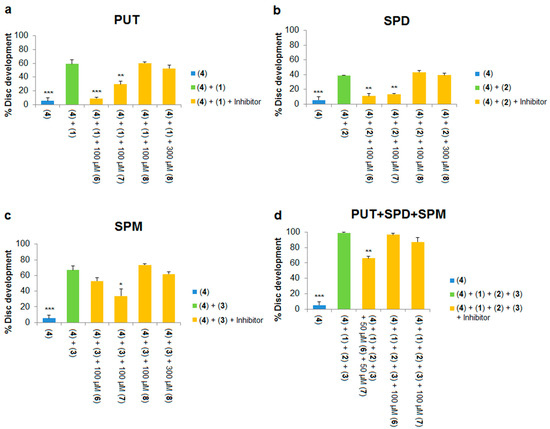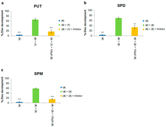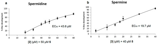Spermidine and spermine block the inhibitory effect of Ant44 (5) on imaginal disc development. Spermidine (2) and spermine (3) were tested at different concentrations in the presence of Ant44 (5) and the percentage of imaginal disc development was recorded for each concentration. (a) Effective concentration of spermidine in blocking the inhibitory effect of Ant44 (5) on imaginal disc development; (b) Effective concentration of spermine in blocking the inhibitory effect of Ant44 (5) on imaginal disc development. Every data point was repeated at least in triplicate. Error bars reflect the standard error of the mean (SEM). Note: the EC50 value is the concentration of the polyamine needed to block 50% of the inhibitory effect of Ant44 (5) on imaginal disc development.