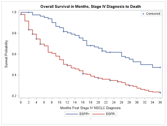 Demographic and clinical characteristics were tested for association with the EGFR mutation. Categorical variables were evaluated using frequencies and proportions, and associations were tested with Chi-Square and Fisher’s exact test. Medians with 1st and 3rd quartiles [Q1, Q3] were used to describe continuous but non-normally distributed data, and Mann-Whitney U-tests were used for comparisons. We performed both univariate and multivariable logistic regressions to identify predictors of EGFR mutation. All factors that were found significant in the univariate logistic regressions were included in the multivariable logistic regression. Odds ratios and 95% confidence intervals were calculated along with likelihood ratio tests for associated p-values. We utilized the Kaplan-Meier product limit method to calculate overall survival (OS) stratified by EGFR status at 12, 24 and 36 months. The log-rank test was used to compare the survival functions. All tests were two-sided with statistical significance at a p-value < 0.05. All statistical analysis was performed using SAS 9.3 (SAS Institute, Cary, NC, USA). The Northern California Kaiser Foundation Research Institute’s Institutional Review Board approved this study with waiver of consent.