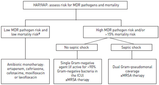 - Kalil, A.C.; Metersky, M.L.; Klompas, M.; Muscedere, J.; Sweeney, D.A.; Palmer, L.B.; Napolitano, L.M.; O’Grady, N.P.; Bartlett, J.G.; Carratala, J.; et al. Management of adults with hospital-acquired and ventilator associated pneumonia: 2016 Clinical practice guidelines by the Infectious Diseases Society of America and the American Thoracic Society. Clin. Infect. Dis. 2016, 63, e61–e111.