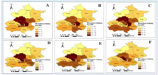 A remarkable reducing trend in TB incidences was noted in the Beijing region from 2009 to 2014 (Figure 1). A higher incidence of TB was found in densely populated districts in Beijing, for example: Haidian (urban function-extended district) and Xicheng. TB incidence rates were noted as high in the Xicheng and Mentougou (ecological preservation, development, and core district of capital function) districts during the whole study period (Figure 1).