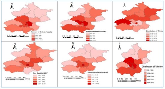 Using GIS technology, this study is the first attempt to estimate the factors associated with TB incidence, taking into account with socio-demographic and health facilities variables at the district level in Beijing. Previously studies have reported that many factors such as GDP per capita, district -level GDP, available health facilities with proper beds, population density, and migrant population may influence TB infection [7,21,36]. Our study found that all predictors were statistically significant in the Spearman correlation coefficient analysis (Table S1). We used consistent spatial regression models to forecast the relationship between TB incidence and predictor variables, and the results of the SEM suggested that the number of beds in hospitals, per capita GDP, population density, and migrant population were significantly correlated with TB incidence in the study location.