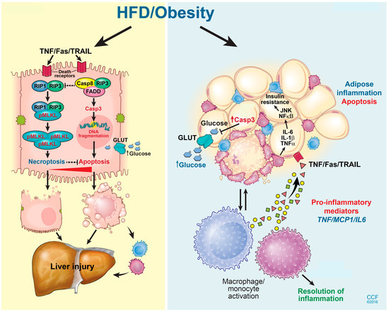 Hepatic cell death pathway and liver injury in response to high fat diet exposure. A HFD induces multiple cell death mechanisms including both caspase-dependent apoptosis and RIP3-driven necroptosis in the liver. Inhibition of RIP3 exacerbates hepatocyte apoptosis following exposure to a HFD, and thus aggravates liver injury and inflammation. A high-fat diet also induces apoptosis in adipocytes. Adipocyte apoptosis drives monocyte/macrophage infiltration, as well as impairs glucose homeostasis. Reprinted with permission, Cleveland Clinic Center for Medical Art & Photography © 2015–2018. All Rights Reserved. Illustration by David Schumick, BS, CMI.