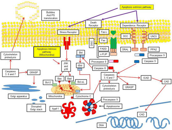 Another target attacked by caspases is the caspase-activated DNase (CAD), an endonuclease found inactive in healthy cells, where it forms a complex with inhibitor-CAD (ICAD) proteins. When apoptosis is initiated, caspases induce a proteolytic attack on ICAD, allowing CAD activation, and the subsequent DNA degradation at internucleosomal sites [50]. In a similar manner, when apoptosis is initiated, caspases also activate a family of proteins known as Golgi reassembly and stacking proteins (GRASP) that participate in Golgi apparatus conformation, cistern formation, and connections leading to Golgi fragmentation and disintegration [5,52].