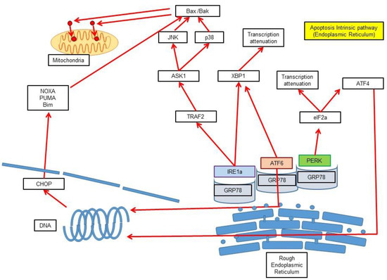 The main stimulus of this pathway is the misfolding of proteins and their subsequent accumulation in the endoplasmic reticulum (ER) (Figure 2). Once the misfolded proteins reach a critical concentration, ER membrane sensors such as protein kinase RNA-like endoplasmic reticulum kinase (PERK), inositol-requiring protein 1 (IRE1a) and activating transcription factor 6 (ATF6) are activated. Initially, PERK phosphorylates the eukaryotic translation initiation factor 2A (EIF2A) to reduce protein transcription and translation as a regulatory feedback mechanism. Other transcription factors such as activating transcription factor 3 (ATF3), activating transcription factor 4 (ATF4), and nuclear erythroid 2-related factor (NrF2) are also inhibited by PERK [31]. On the other hand, IRE1a possesses RNAse activity and activates X-Box-binding protein-1 (XBP1), which, in turn, activates the production of ER chaperone proteins and endoplasmic reticulum-associated degradation (ERAD) products. Further, ATF6 migrates to the Golgi apparatus, where it is proteolytically activated into ATF6n, which also promotes XBP1 production. Apoptosis occurs through the association of IRE1 with Bax and Bak and at the same time the activation of the MAP kinases p38 and Jun N-terminal kinases (JNK) when these sensor mechanisms are not able to compensate the misfolded protein concentration [31].