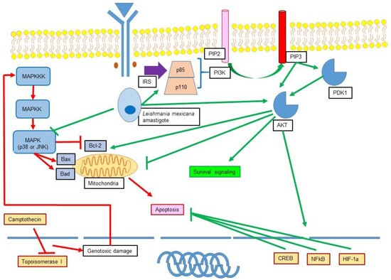 The main type of programmed cell death observed in infections is apoptosis [125,126,127]. Apoptosis inhibition is a resource to which many intracellular organisms such as bacteria, virus, fungi, and parasites recur. By doing this, microorganisms achieve persistence in cells to obtain nutrients, reproduce, and avoid being recognized by the immune system. A thoroughly studied example of inhibition of apoptosis by an intracellular pathogen is the one caused by Leishmania (Figure 3).