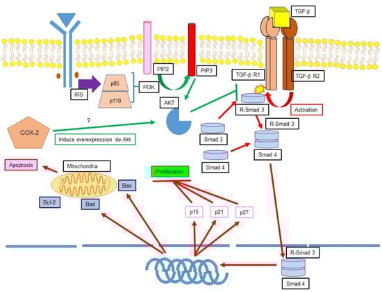 The signalling pathway of the TGF-β has a dual capacity: it can either suppress or promote neoplastic cell growth. It has been described that in both healthy cells and early-stage cancer cells, TGF-β can induce cell-cycle arrest and apoptosis, thus having tumour-suppressor functions. However, there is evidence that proves that in late-stage cancer cells, TGF-β can promote tumorigenesis, metastasis, and chemoresistance [147]. This signalling pathway starts with TGF-β binding to the transforming-growth-factor-β Receptor (TGF-βR). TGF-βR possesses two isoforms, TGF-βRI and TGF-βRII. The binding of TGF-β to TGF-βR1 causes phosphorylation of Ser and Thr residues [148], which in turn activate the adaptor proteins Smad2 and Smad3, forming the R-Smad2 and R-Smad3 complexes [149]. After this process is complete, the recently formed complex binds to Smad4, which is then translocated to the nucleus and regulates gene expression [150]. In early-stage cancer cells, TGF-β can induce apoptosis in transforming cells, however, the events that lead to tumorigenesis cause an attenuation of the cellular response towards these molecules, while TGF-β activation is increased. This, in turn, produces an overactivation of proinflammatory cytokine expression [151]. In 2003, Song and colleagues demonstrated that prostate cancer cells inhibit TGF-βRI through Akt, thus blocking the activation of Smad3. Additionally, during this survival promotion process PI3K and phosphatase and tensin homolog (PTEN) participate [152].