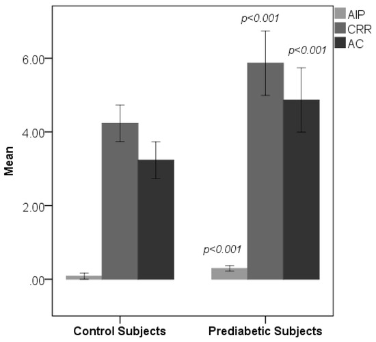 Comparison of atherogenic indices between control and prediabetic subjects. Atherogenic index of plasma (AIP) cardiac risk ratio (CRR) and atherogenic coefficient (AC).